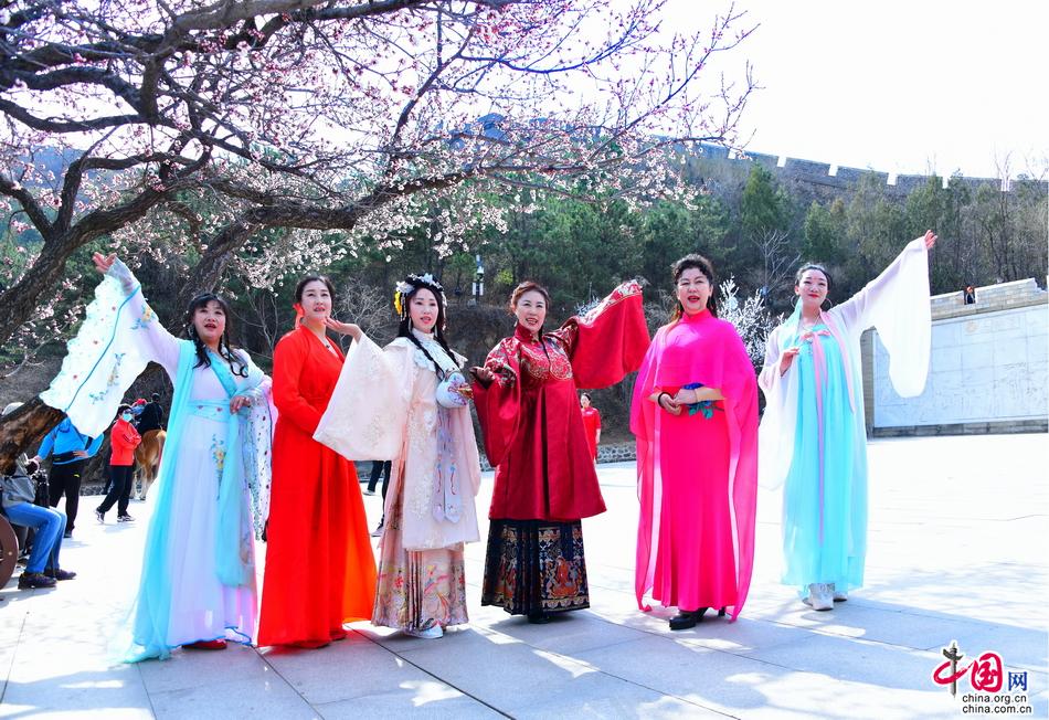 来自河北滦平县女企业家协会和滦平县旗袍协会的会员们着华服兴礼仪之邦。五彩缤纷的华服给金山岭长城杏花节增添了别样的色彩,在古老长城上成为一道亮丽风景线。