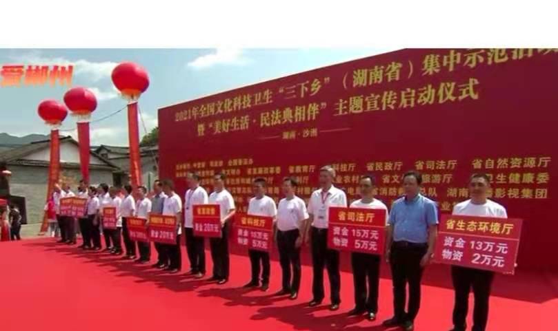 活动现场,司法部向郴州市沙洲村等4个荣获第八批“全国民主法治示范村”称号的村颁授匾牌,中央有关部门负责人向汝城县赠送民法典学习读本,湖南省司法厅向汝城县民法典宣传小分队授旗。司法部等中央有关单位、湖南省委宣传部等省直有关单位分别向汝城县进行了捐赠,共捐赠资金306万元、项目资金470万元以及价值186万元的物资。