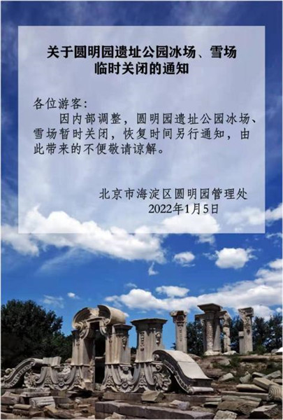 内部调整 圆明园遗址公园冰场、雪场暂时关闭