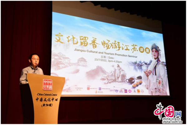 中国网7月25日电 由江苏省文化和旅游厅主办、江苏旅游(新马)推广中心协办,新加坡中国文化中心、中国驻新加坡旅游办事处及新加坡江苏会全力支持的“文化留香·畅游江苏”讲座,于2022年7月23日(星期六)在新加坡中国文化中心4楼剧场举行。江苏省文化和旅游厅副厅长李川通过连线参与本次活动,新加坡旅游局助理署长(国际司)陈蕙敏、中国文化中心兼中国驻新加坡旅游办事处主任肖江华、江苏省驻新加坡经贸代表处主任代表沈立国,以及来自新加坡文化艺术界、旅游界、商界、社团、新闻媒体及市民大众等逾200名观众现场出席活动。