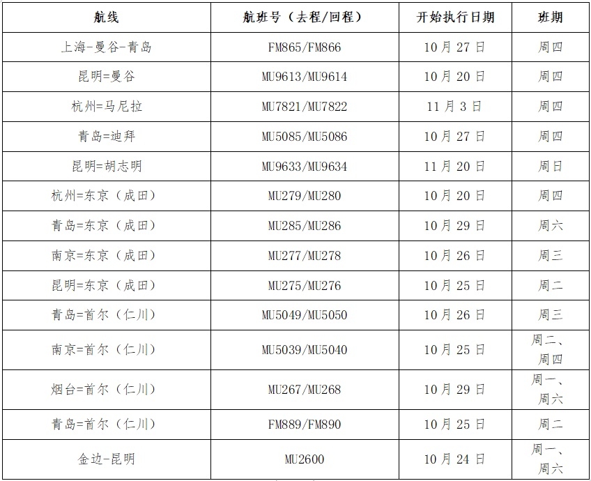 据悉,此次新增的国际航线将于10月20日起逐步开始执行,其中昆明-曼谷、杭州-东京成田航线20日起恢复,每周1班;金边-昆明航线24日起增至每周2班,昆明-东京成田、南京-首尔仁川、青岛-首尔仁川航线25日起恢复;南京-东京成田、青岛-首尔仁川航线26日增至每周1班;上海-曼谷-青岛、青岛-迪拜航线27日增至每周1班;青岛-东京成田、烟台-首尔仁川航线29日起执行。进入11月,东航还将陆续恢复和加密杭州-马尼拉、昆明-胡志明等国际航线。具体航班计划以东航官网实际查询为准。