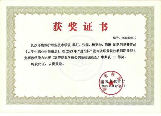 2023年,杨英华老师团队的参赛作品《绿水青山守护者 担当奉献职场人》,获得2023年“楚怡杯”湖南省职业院校教师职业能力竞赛教学能力比赛二等奖。其中的“绿水青山守护者”课程思政体系,引导学生树立新时代环保人“推动绿色发展,促进人与自然和谐共生”的职业使命。