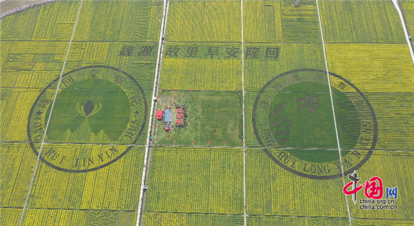 今年,隆回县司门前镇石山湾村利用小麦和五彩油菜花,勾画出两个直径达300米的“隆回金银花”“隆回龙牙百合”地理标志图案,以及“魏源故里、早安隆回”巨幅字形,通过空中鸟瞰,图案和字形清晰可见,令人赏心悦目。远眺山谷间的连片长条形油菜花海,宛若一幅醉人的江南山水田园画。