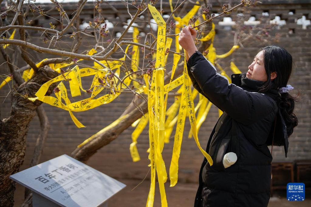 4月4日,一名女士将寄托哀思的黄丝带绑在李大钊故居内的丁香树上。新华社记者 牟宇 摄