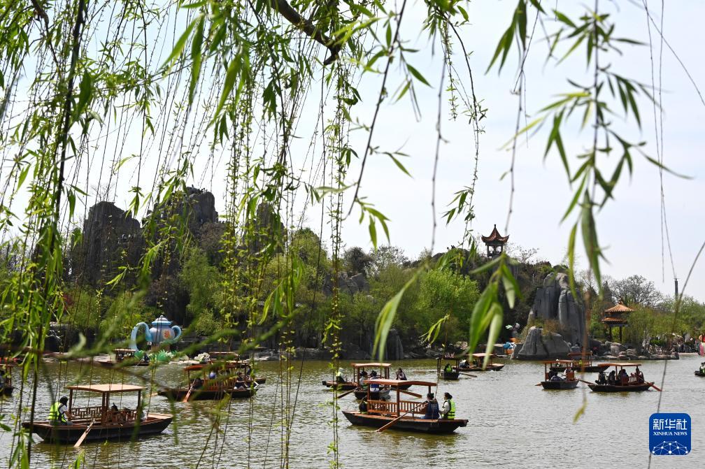 4月6日,游客在河南省开封市翰园碑林内划船游玩。新华社发(李俊生 摄)