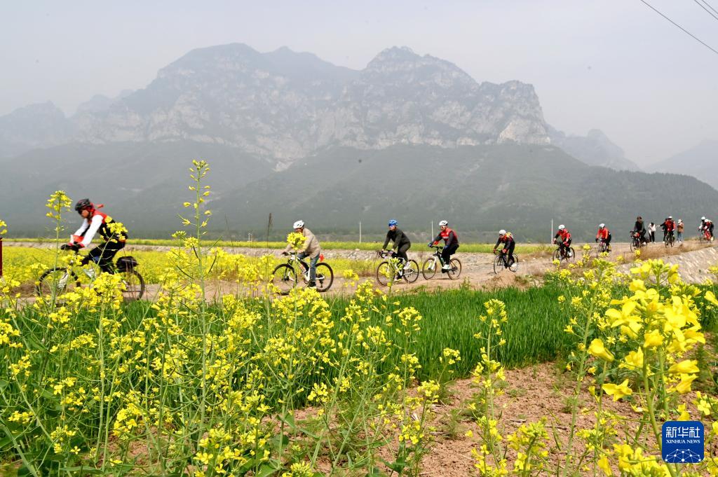 4月5日,骑行爱好者在河南省沁阳市紫陵镇赵寨村“千亩花海”的乡间道路上骑行。新华社发(杨帆摄)
