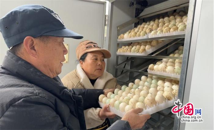 在颗砂乡旭东村凤头鸭孵化基地,工作人员正在将新出的鸭蛋送进孵化箱,鸭蛋在槽架上整齐排列,通过设置恒定温度和湿度,确保最佳孵化条件。旭东村家繁畜牧养殖专业合作社理事长田绍家介绍,该合作社2024年共繁育凤头鸭4.5万羽,从2024年11月开始售卖,截至年底已销售2万羽,创收200余万元。合作社通过吸纳周边农户养殖凤头鸭,带动185户百姓就业增收。
