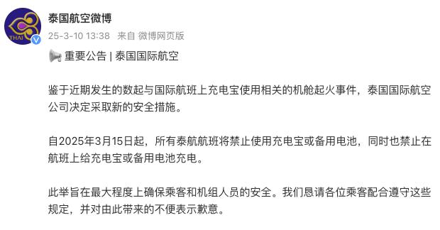 3月10日,泰国航空官方微博发布公告:鉴于近期发生的数起与国际航班上充电宝使用相关的机舱起火事件,泰国国际航空公司决定采取新的安全措施。自2025年3月15日起,所有泰航航班将禁止使用充电宝或备用电池,同时也禁止在航班上给充电宝或备用电池充电。
