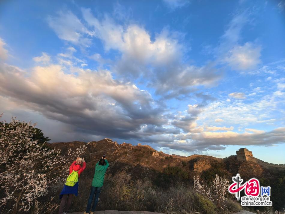 山风掠过箭楼,雪浪般的花瓣簌簌跌落在青砖路上,与远处蜿蜒的城墙构成水墨丹青般的时空叠影。