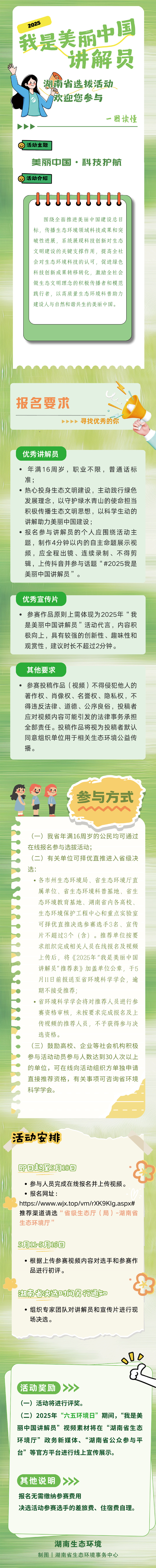 近日,湖南省生态环境厅发布《关于开展2025年“我是美丽中国讲解员”湖南省选拔活动的通知》(以下简称《通知》)。《通知》称,根据生态环境部办公厅《关于举办2025年“我是美丽中国讲解员”活动的通知》(环办科财函〔2025〕129号)要求,湖南省生态环境厅将于 开展2025年“我是美丽中国讲解员”湖南省选拔活动。即日起至5月10日,参与人员需完成在线报名并上传视频,湖南省年满16周岁的公民均可通过在线报名参与选拔活动;有关单位可择优直推进入省级决选。