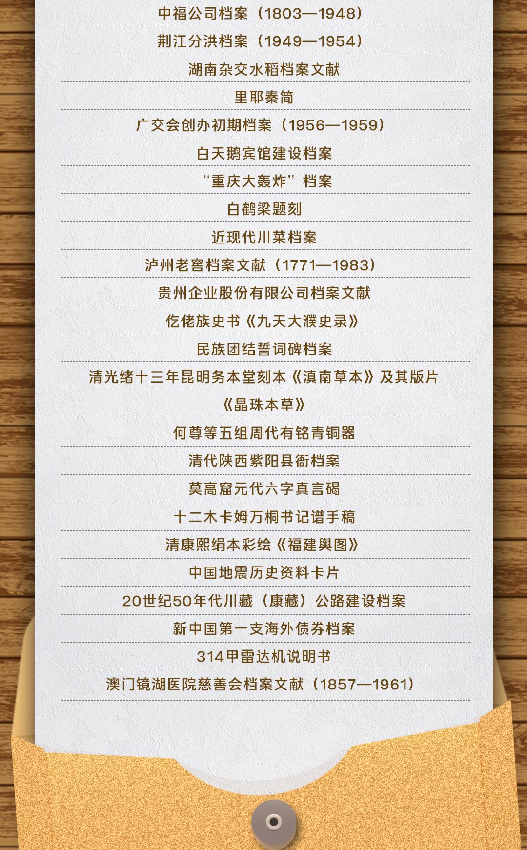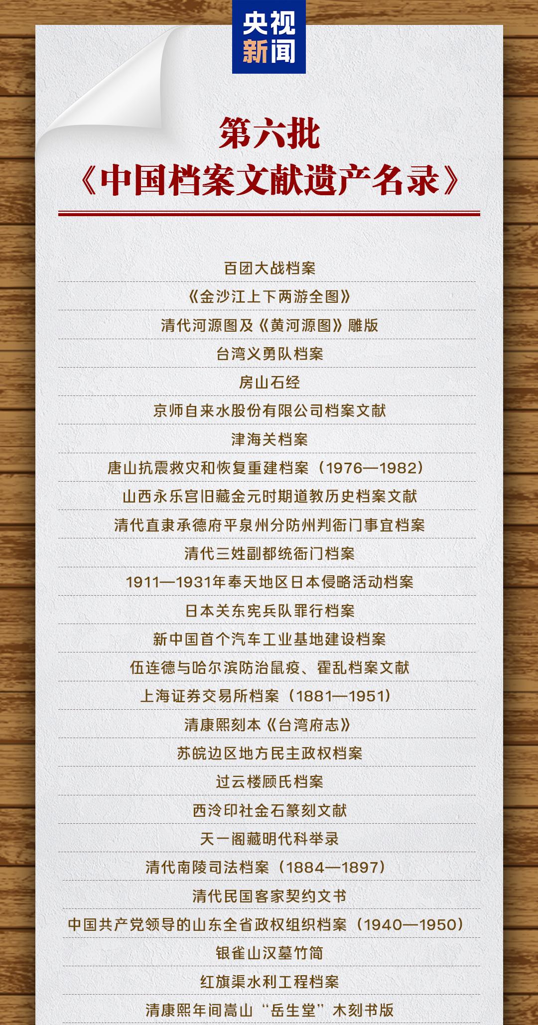 6月9日是国际档案日。档案,见证着历史,传承着文化。国家档案局公布第六批《中国档案文献遗产名录》,其中包括《百团大战档案》《“重庆大轰炸”档案》《红旗渠水利工程档案》《何尊等五组周代有铭青铜器》《银雀山汉墓竹简》《广交会创办初期档案(1956—1959)》《民族团结誓词碑档案》等52个项目。