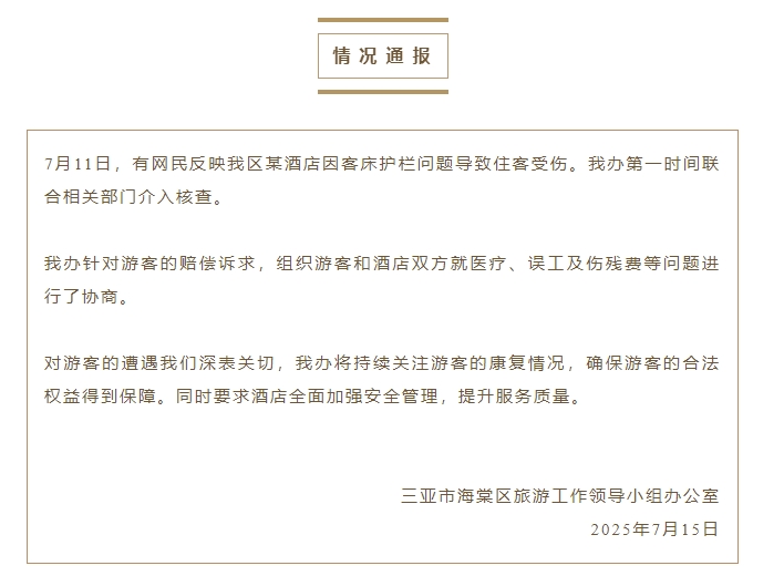 据“海棠旅文”微信公众号消息,7月15日,三亚市海棠区旅游工作领导小组办公室发布情况通报称,7月11日,有网民反映该区某酒店因客床护栏问题导致住客受伤。三亚市海棠区旅游工作领导小组办公室第一时间联合相关部门介入核查。