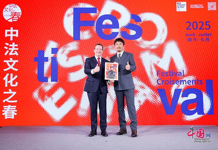 法国现任驻华大使白玉堂为沈腾颁发宣传大使证书。(法国大使馆供图)