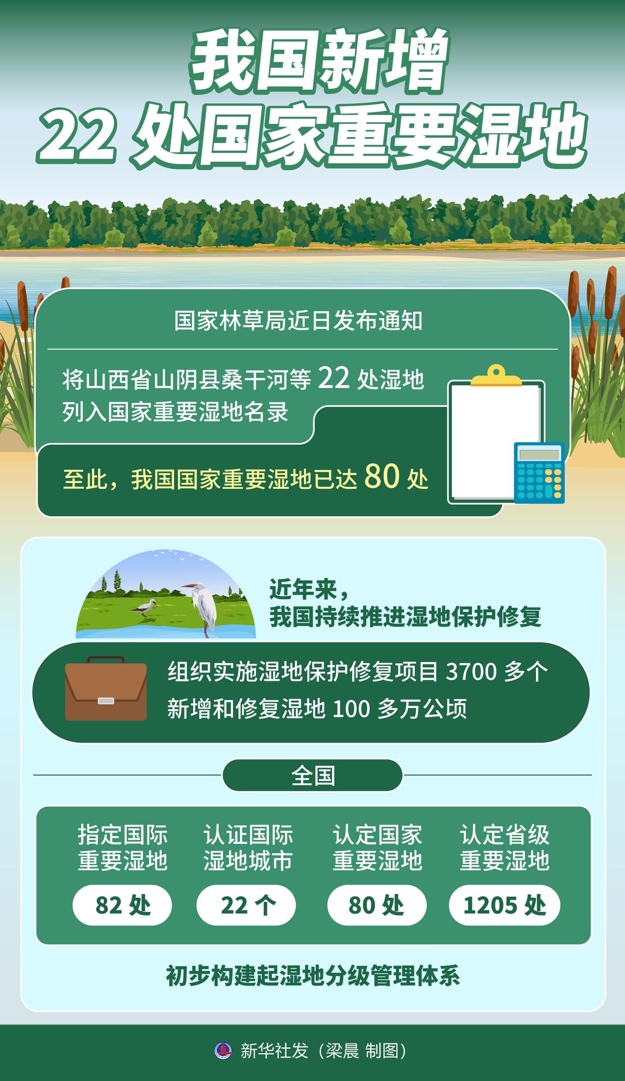 近年来,我国持续推进湿地保护修复,组织实施湿地保护修复项目3700多个,新增和修复湿地100多万公顷。全国共指定国际重要湿地82处、认证国际湿地城市22个、认定80处国家重要湿地和1205处省级重要湿地,初步构建起湿地分级管理体系。
