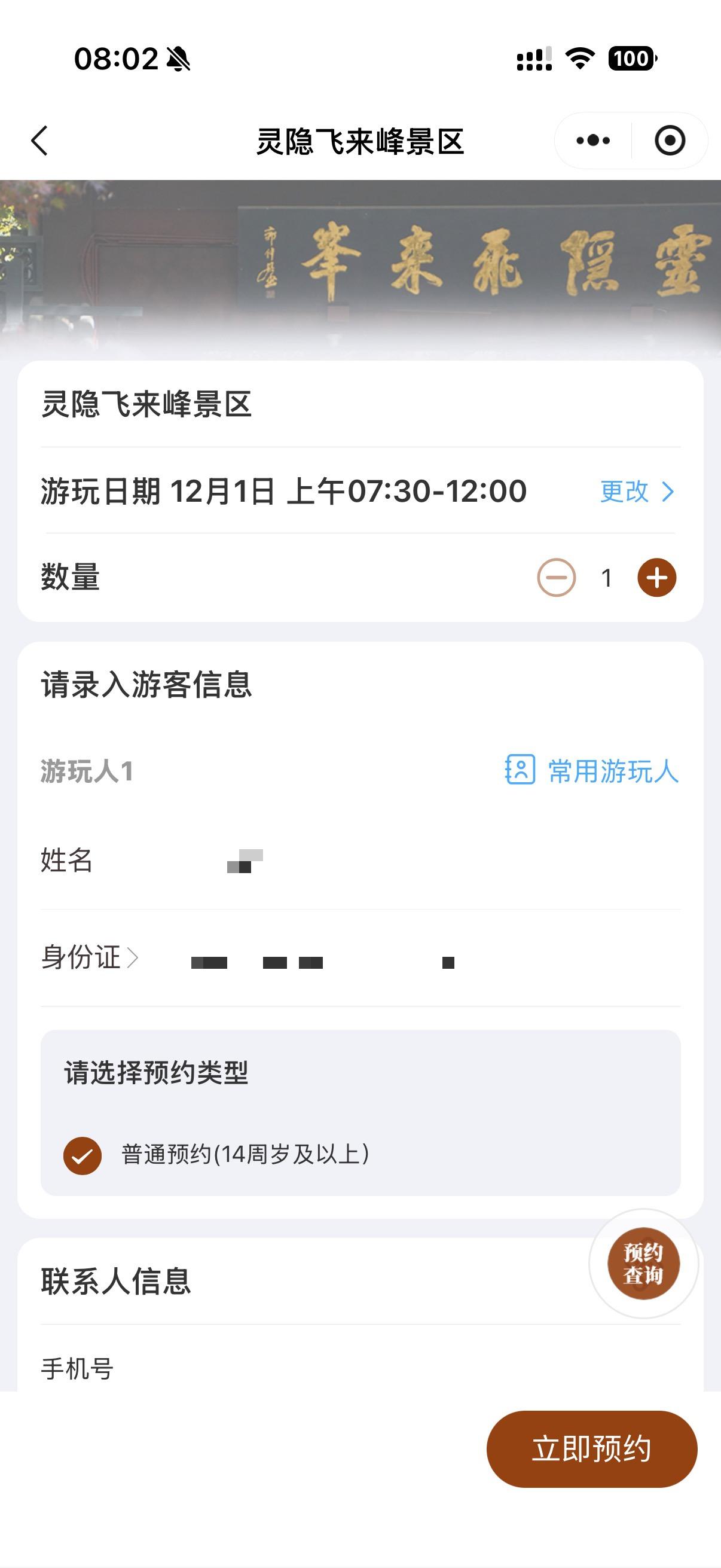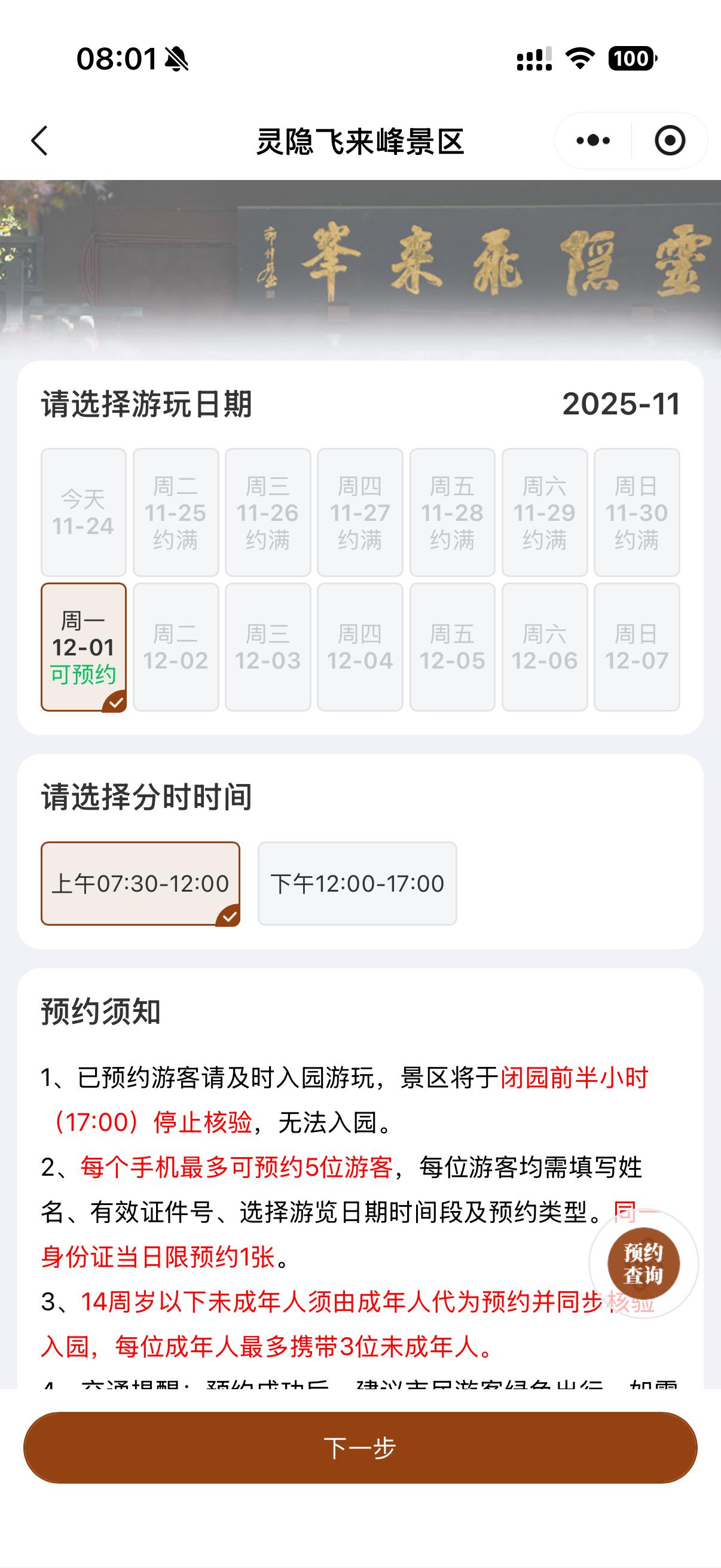 灵隐飞来峰景区不接受当天预约,一定要提前预约,至少提前1天预约,可以预约未来7天的名额。
