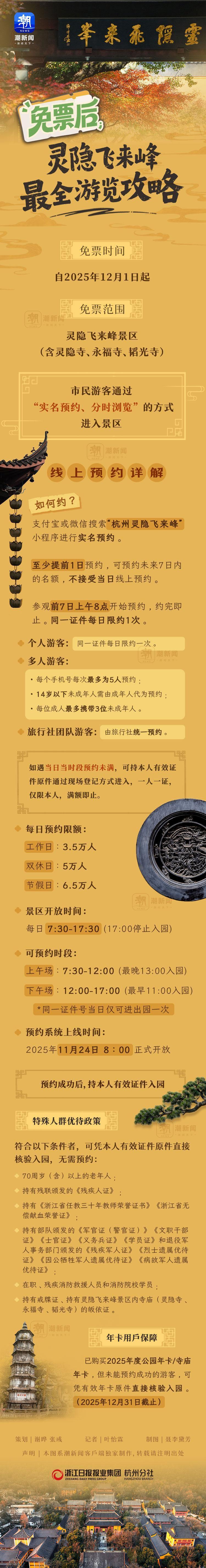 预约系统于今日(11月24日)正式启用,同时开放了12月1日免票首日的3.5万个入园名额。市民游客可在微信或支付宝平台搜索“杭州灵隐飞来峰”小程序,进入后按提示完成预约操作。