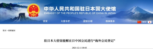 驻日本大使馆提醒在日中国公民进行“海外公民登记”。
