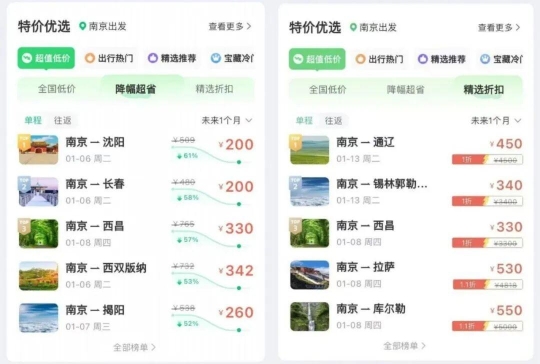 另据南京发布,南京飞往沈阳、长春、西昌、西双版纳、揭阳等热门旅游目的地的机票票价降幅也都超50%,出发至通辽、锡林郭勒等地机票甚至出现1折机票。