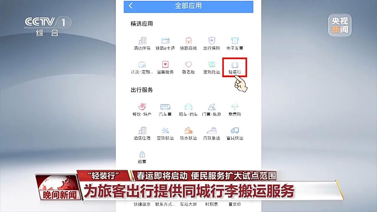 “轻装行”是铁路部门为旅客出行提供的“门到站”“站到门”同城行李搬运服务。已购车票的旅客只需打开铁路12306App或微信小程序,在首页中部应用栏向左滑动,找到“全部应用”,点击进入即可找到“轻装行”模块,根据需求预约下单。