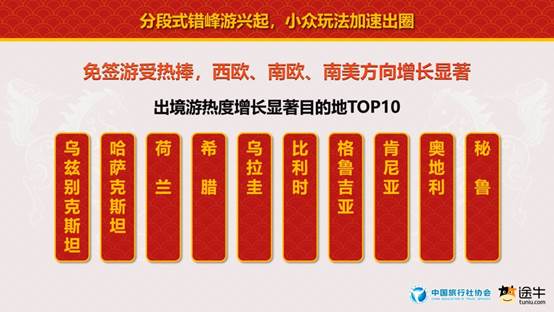 此外,哈萨克斯坦、乌兹别克斯坦、高加索三国等免签目的地,以及欧洲方向的荷兰、希腊、比利时、奥地利,南美方向的乌拉圭、秘鲁等小众目的地热度增长显著。