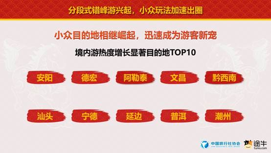 新兴、小众目的地方面,数据显示,安阳、德宏、阿勒泰、文昌、黔西南、汕头、宁德、延边、普洱、潮州等低线及县域城市预订热度增长显著。越来越多游客将目光转向小城、县城,追求烟火与乡土气息的旅行体验。