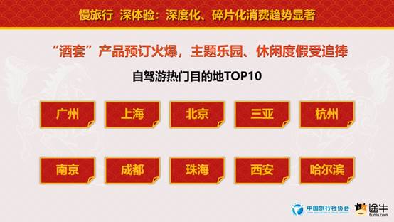 广州、上海、北京、三亚、杭州、南京、成都、珠海、西安、哈尔滨等目的地是自驾游用户的热门选择。上海迪士尼度假区、珠海长隆度假区、广州长隆度假区、北京环球度假区、哈尔滨冰雪大世界等“酒店+主题乐园门票”,以及“酒店+温泉”“酒店+门票”等产品成为更多自驾游用户的选择。