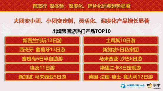 “新西兰纯玩12日游”“土耳其10日游”“西班牙-葡萄牙13日游”“新加坡5日私家团”“塞班岛6日半自助游”等深度游产品则是用户出境跟团游的热门选择。