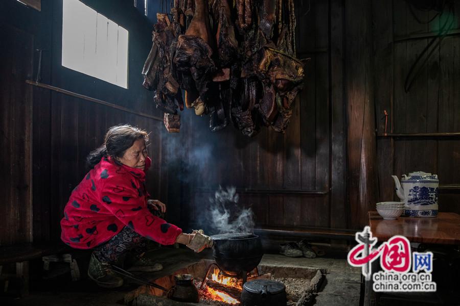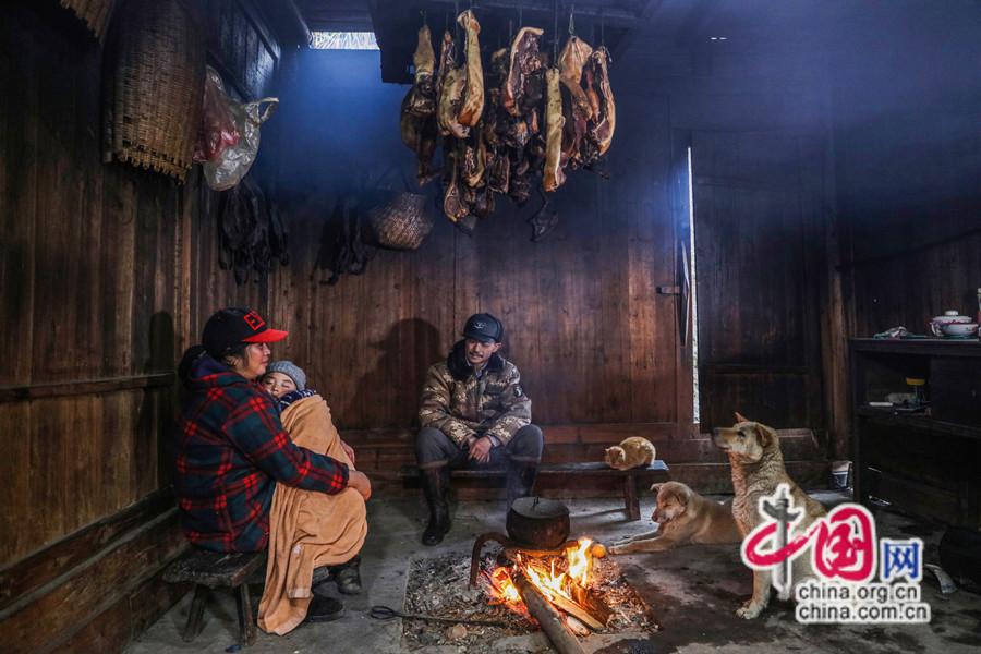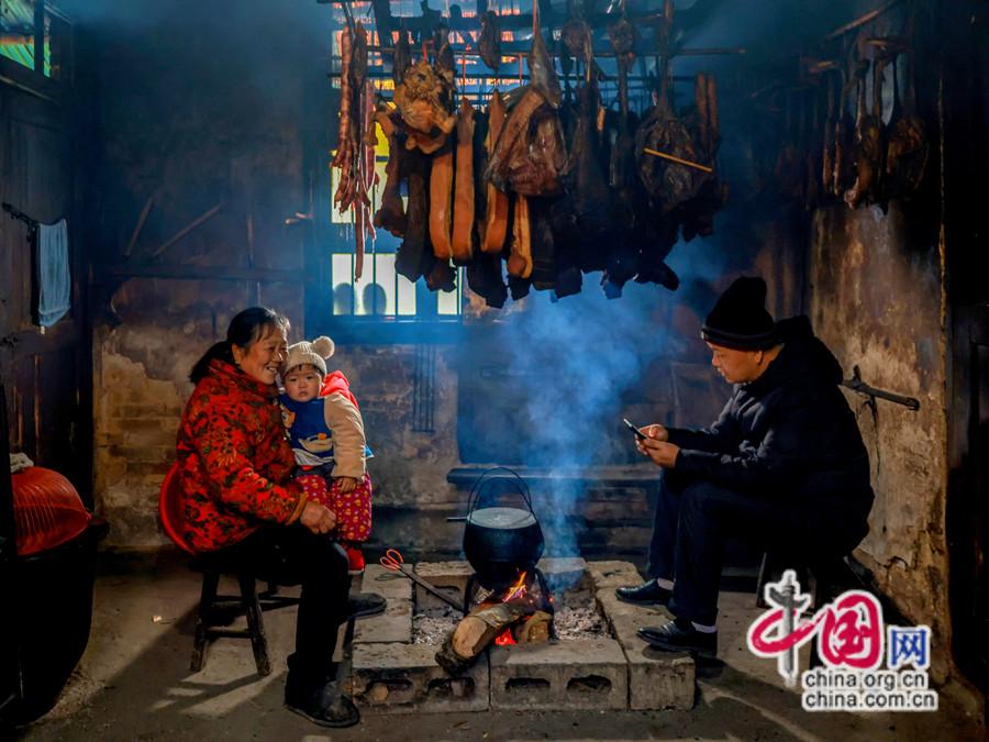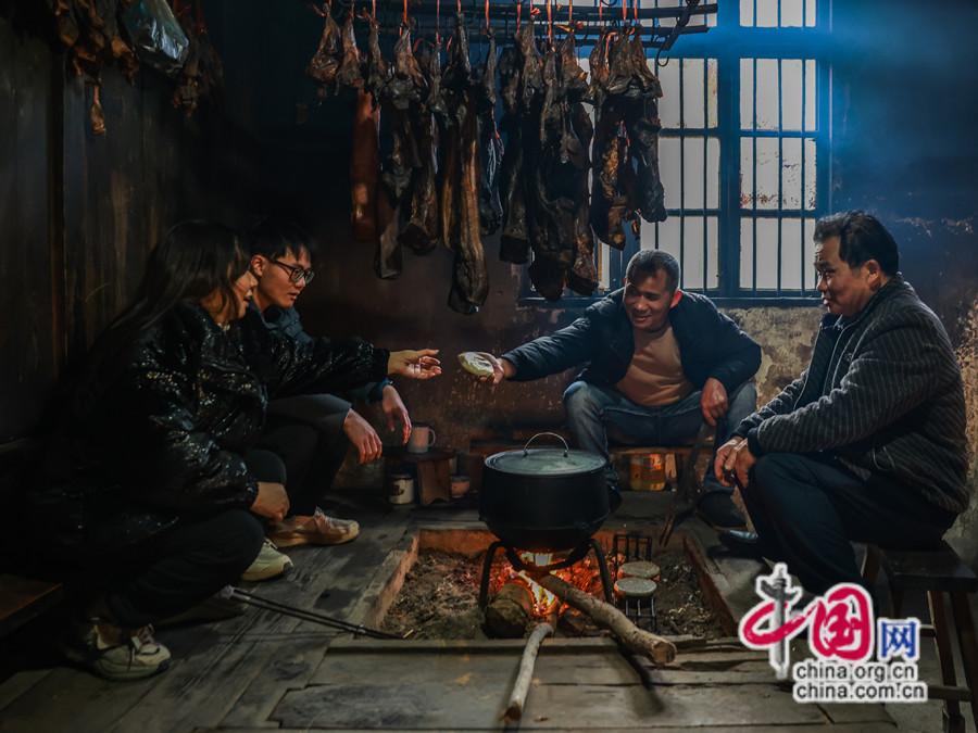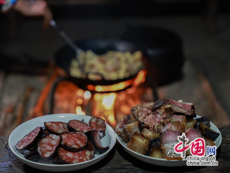 火塘边,铁鼎罐咕嘟作响。腊肉与冬笋、萝卜炖煮,香味弥漫。米饭在柴火灶上焖出焦香锅巴,碗盏围着火塘摆开,火光便把每个人的脸映得通红。这便是滚烫的年味——火塘守着家,腊肉守着岁月,一家人守着火光。