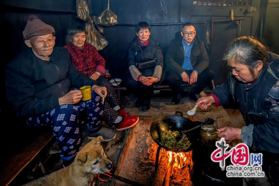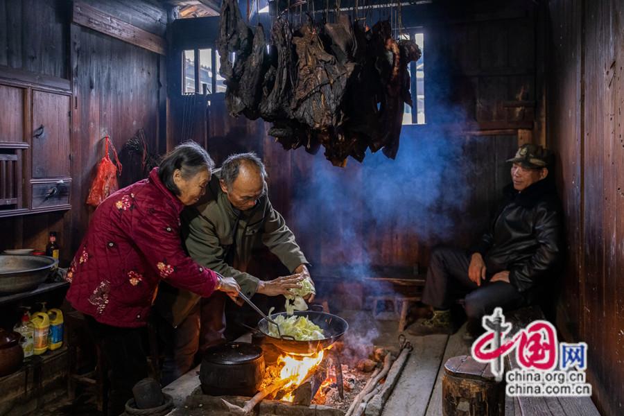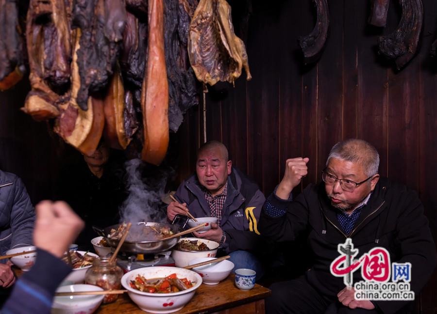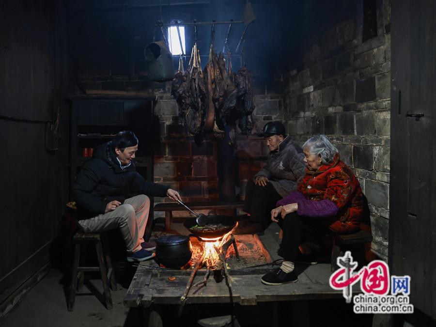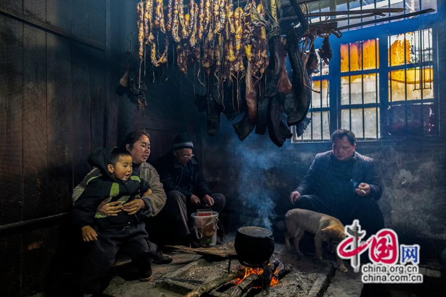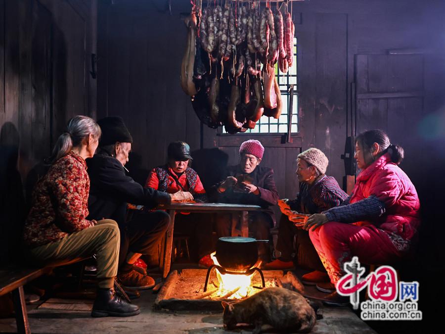 火塘边,铁鼎罐咕嘟作响。腊肉与冬笋、萝卜炖煮,香味弥漫。米饭在柴火灶上焖出焦香锅巴,碗盏围着火塘摆开,火光便把每个人的脸映得通红。这便是滚烫的年味——火塘守着家,腊肉守着岁月,一家人守着火光。