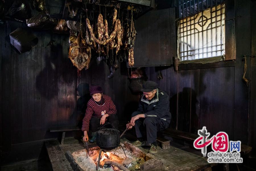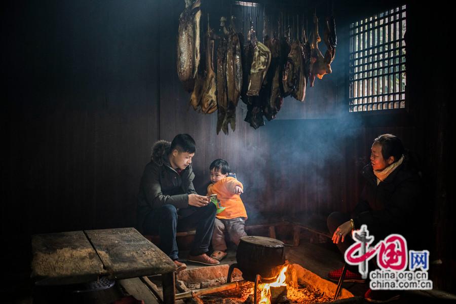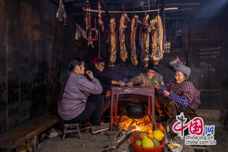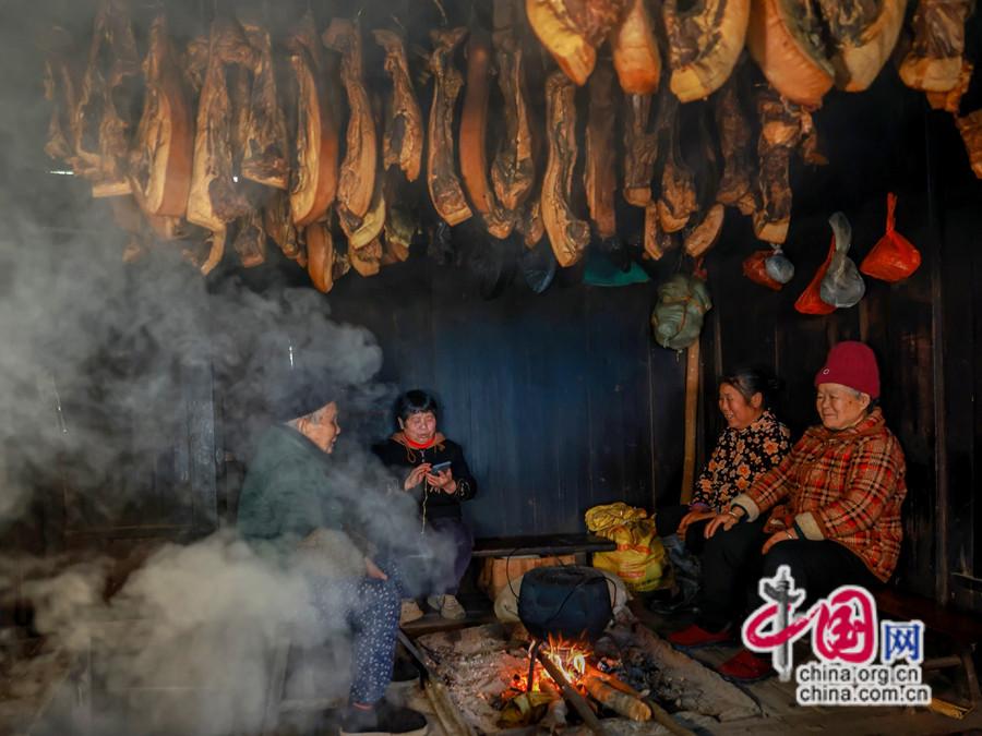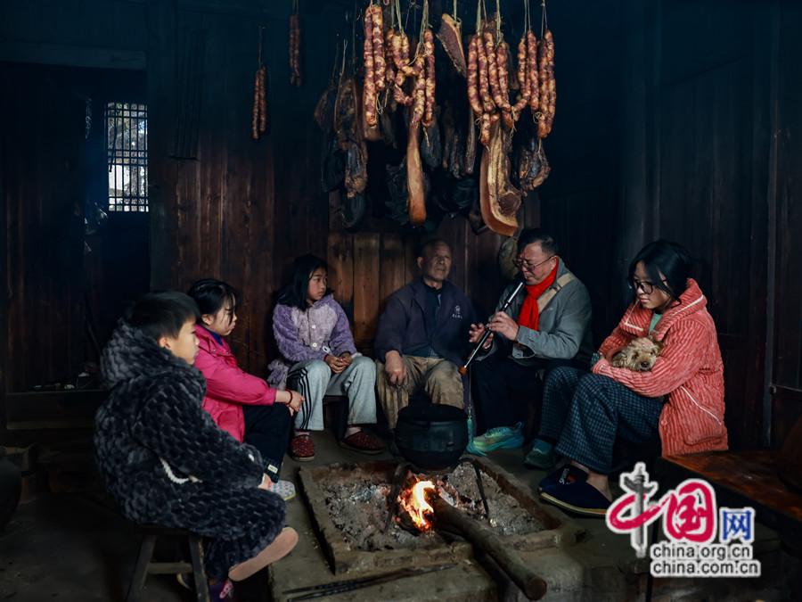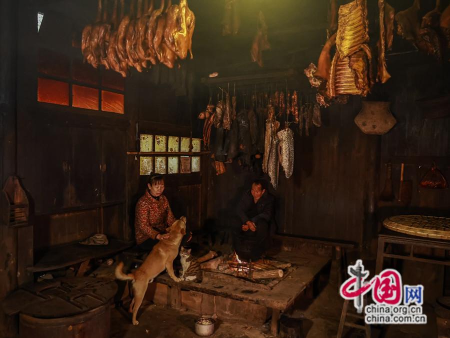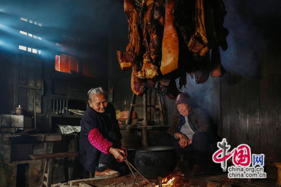 寒冬腊月,在湖南怀化市洪江古商城周边的村寨木楼,火塘是腊月的“心脏”。塘火日夜不熄,映着梁上垂下的腊肉——那是怀化山乡最浓墨重彩的年画。乌黑的肉块沁着油脂,在烟火的慢炖里沉淀出琥珀色的光,那是松香、茶树与人间烟火共同秘制的年味。