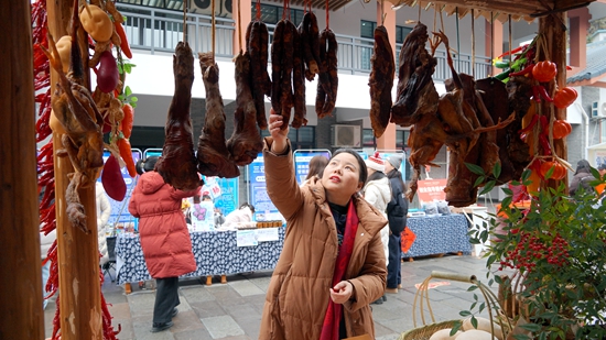 毗邻的年货展销区更是热闹非凡,红灯笼高高挂起,吆喝声、询价声、欢笑声此起彼伏。展销区内品类丰富、琳琅满目:糖果蜜饯区甜香四溢,特产区汇聚山野珍馐,腊货区的腊肠、腊肉泛着油润光泽,咸香扑鼻;茶叶区茶罐列阵,醇厚茶香与浓浓年味缠绵交融。本土商户们热情推介,市民游客满载而归,市集不仅激活了新春消费市场,更让本土特色产品走出深山、走向大众。